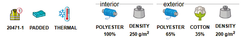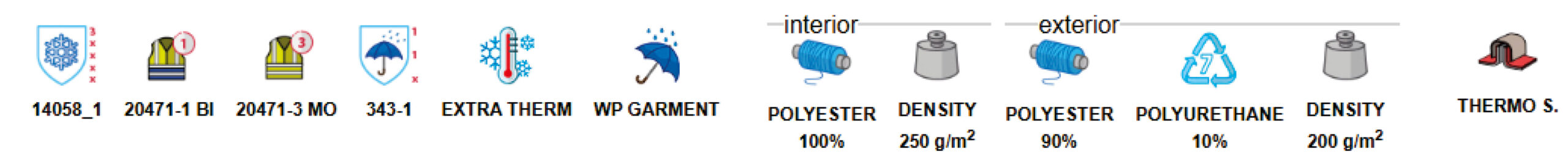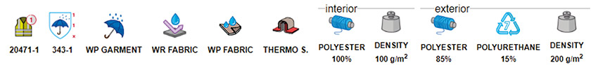 - Ένδυμα πιστοποιημένο ως υψηλής ορατότητας Category II PPE, Class 3 for single-colour models and Class 1 for two-tone models, Protection against Cold Environments, Class 3-x-x-x and Protection against Rain, Class 1-1-x: based on 13688, 20471, 14058 and 343 standards, μέγιστος αριθμός πλυσίματος 25