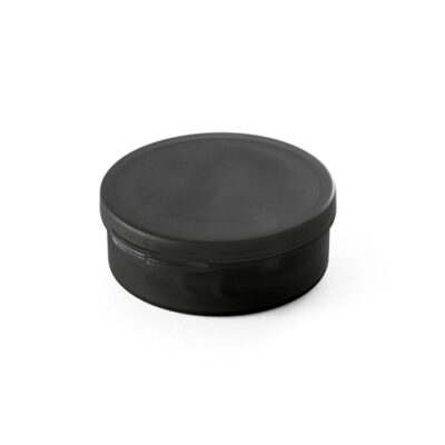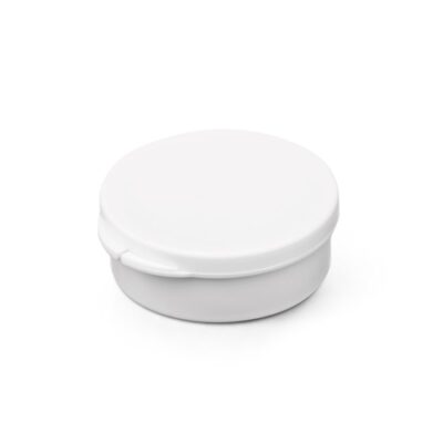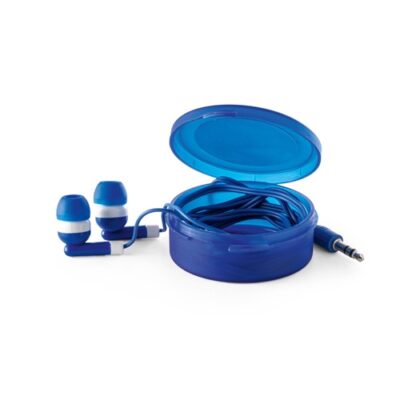 Plastic audio headphones in plastic case. Jack connector 3.5 mm, cable length 1.2 m. box ø50 mm