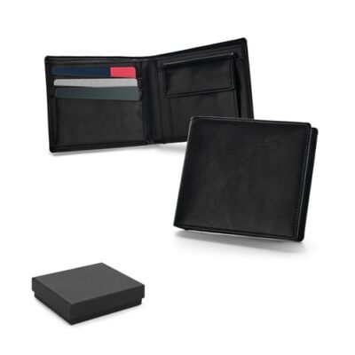 RFID blocking leather wallet with a coin pocket, bills pocket and inserts for 9 cards. Wallet supplied in a gift box. 110 x 92 x 13 mm | Box: 130 x 109 x 24 mm