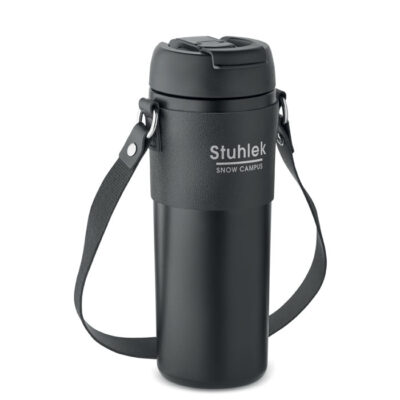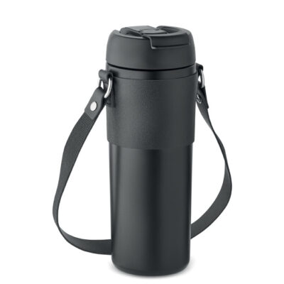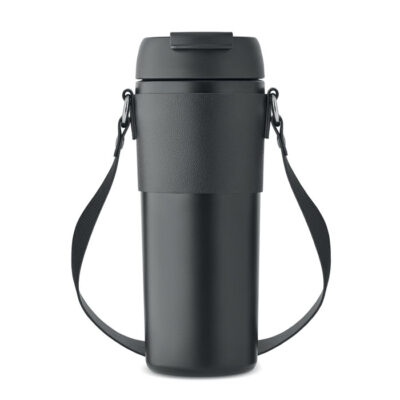 Double wall stainless steel powder coated tumbler with PP lid (2-in-1 straw lid) and with PU carry strap. Leak-free. Capacity: 700 ml.