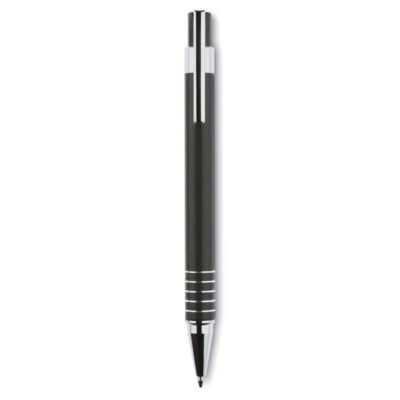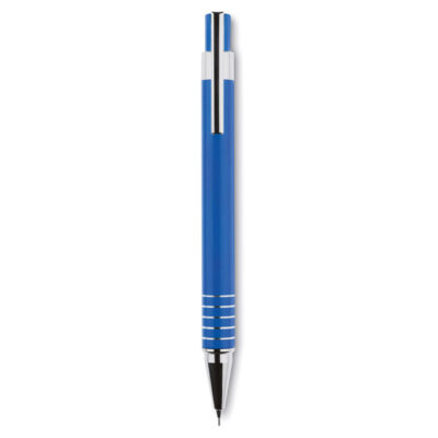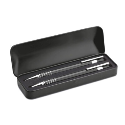 Aluminium ball pen set including a blue ink push type ball pen and a mechanical pencil in matching metal box.