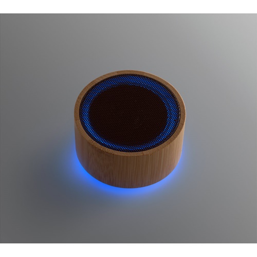 Bamboo and ABS speaker. It has 50 BT transmission to connect to your mobile device. It has battery power of 3W and capacity up to 300 mAh that allows an autonomy up to 2 hours. Supplied in a kraft paper gift box. As the product is made from natural materials, the colour and the printing result may vary between products. Ø74 x 42 mm