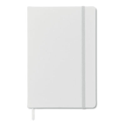 A5 notebook with hard PU cover. Casebound. 192 plain pages (96 sheets). Matching elastic closure strap and ribbon page-marker.