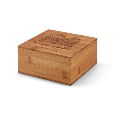 “Bamboo tea box with 4 compartments and magnet closure. This tea box includes 40 tea bags of Gorreana Azores tea (20 bags of black tea and 20 bags of green tea). Supplied in a kraft box. As the product is made from natural materials, the colour and the printing result may vary between products. 160 x 160 x 78 mm | Kraft box: 166 x 166 x 85 mm”