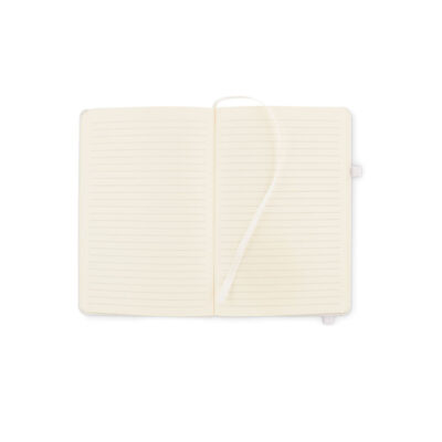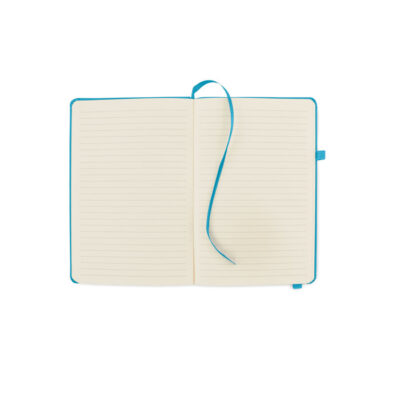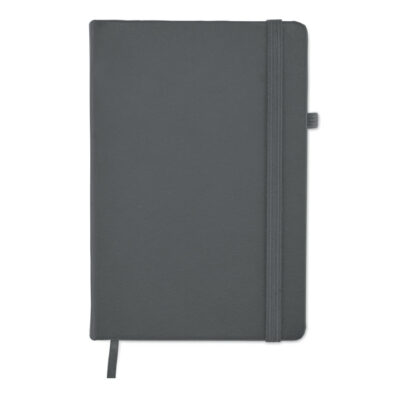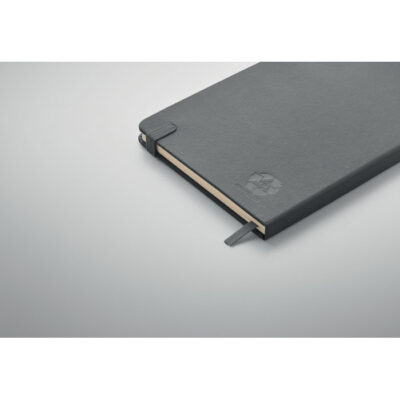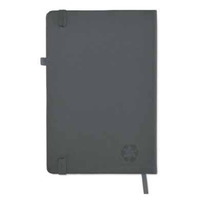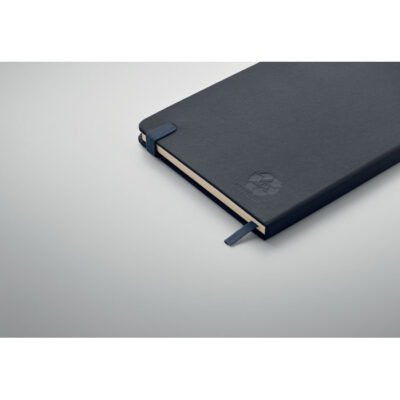 A5 notebook with recycled PU cover. Casebound. 192 recycled paper lined pages (96 sheets). Matching elastic closure strap and ribbon page-marker and pen holder.