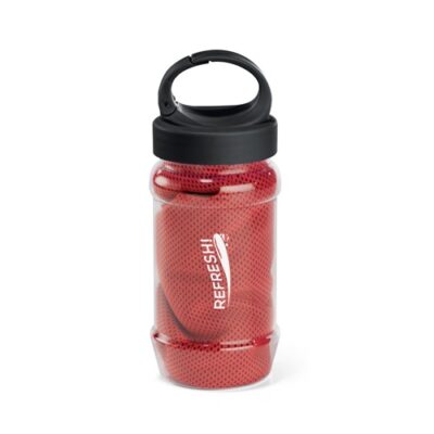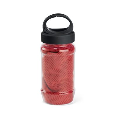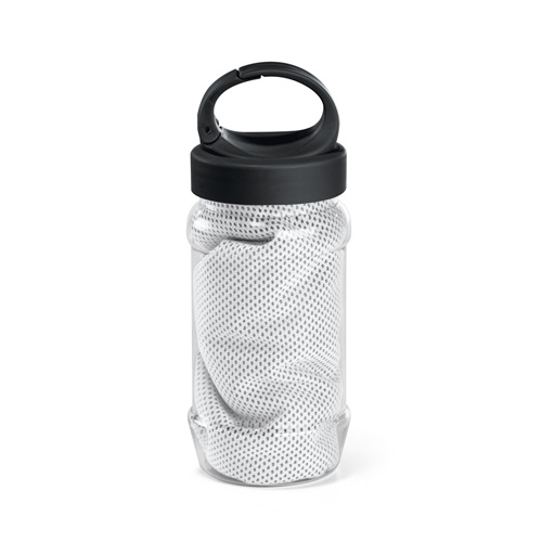 Set with a PP and PET bottle and a polyamide and polyester sports towel. Bottle with handle, practical to be taken anywhere and capacity up to 440 mL. Refreshing towel that, when wet, stays cool for a few hours. If it warms up, just shake it, reactivating its freshness. The towel is reusable and washable in the washing machine. Towel: 300 x 800 mm | Bottle: ø65 x 183 mm