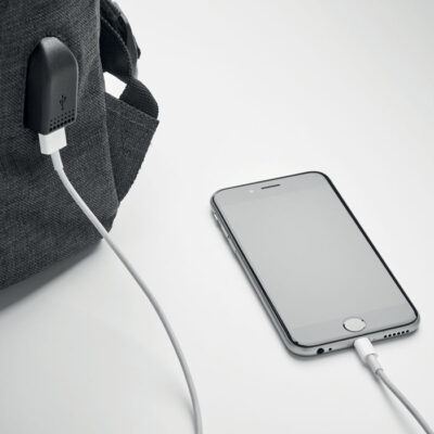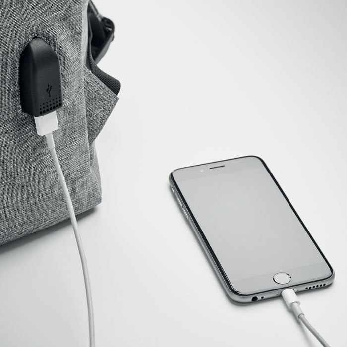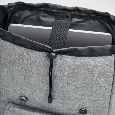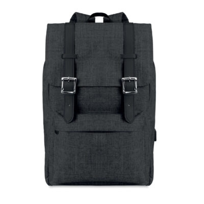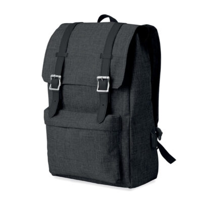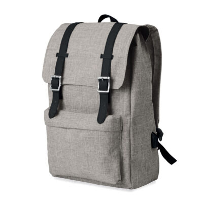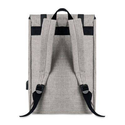 Computer backpack in 600D 2 tone polyester with padded shoulder strap including one main internal compartment for 15 inch laptop and a USB charging cable. Includes magnetic snap button closure and one zippered front compartment.