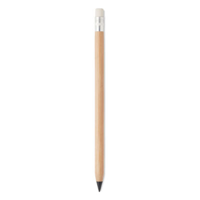 Long-lasting bamboo inkless pen with bamboo barrel and eraser on top with paper cap. The pen writes with the metal alloy tip.
