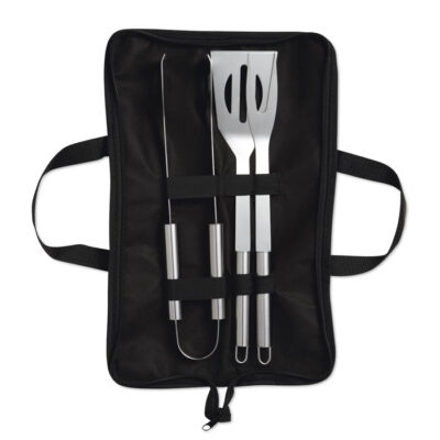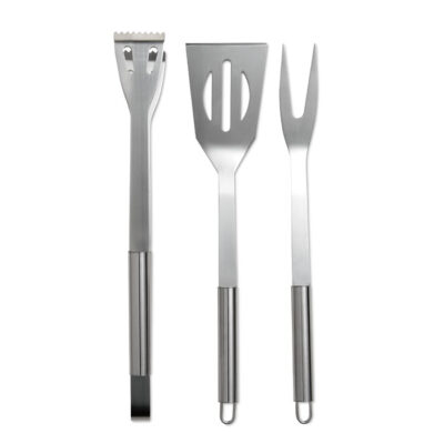 Set of 3 stainless steel barbecue tools in nonwoven pouch with zipper.