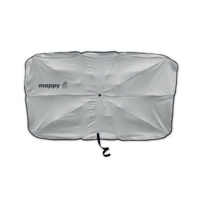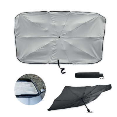 Windshield sun shade car umbrella in 190T pongee with 1 side silver UV (SPF50) lining. Manual open/close.