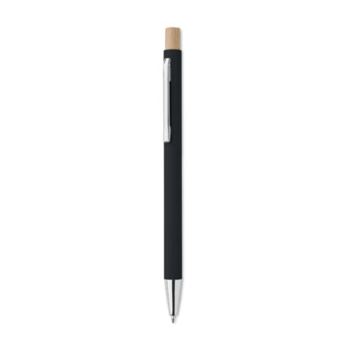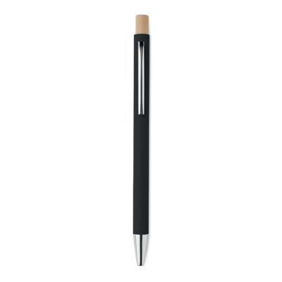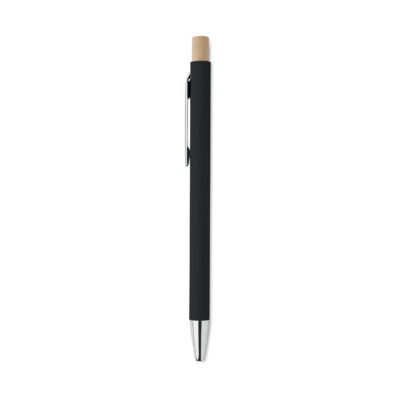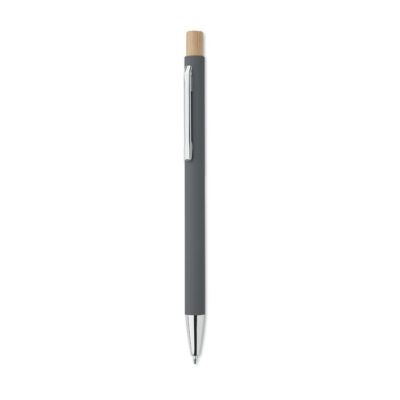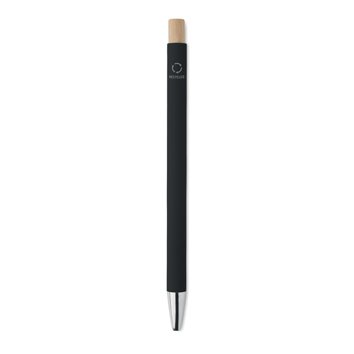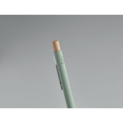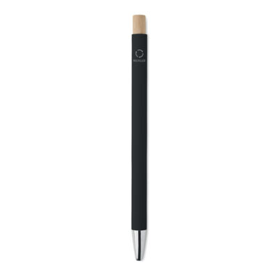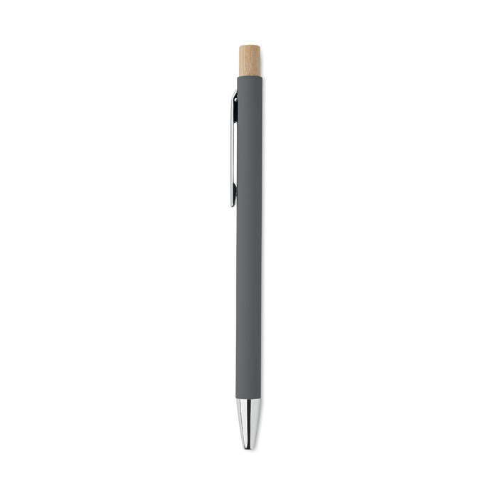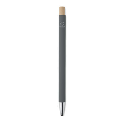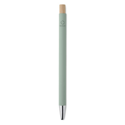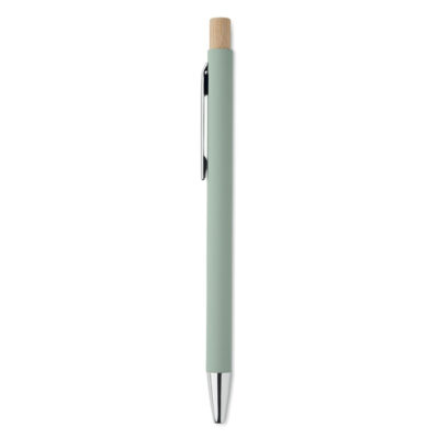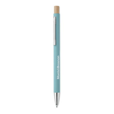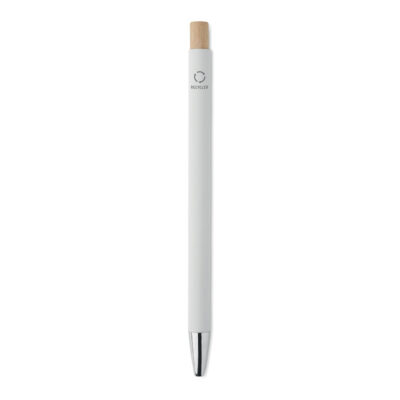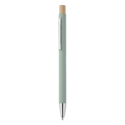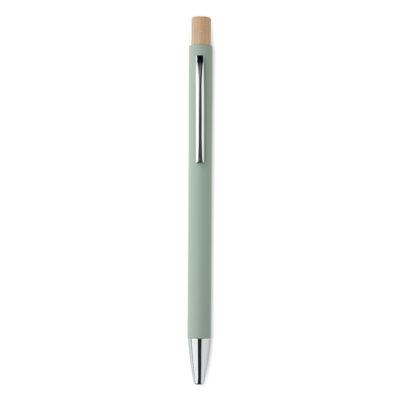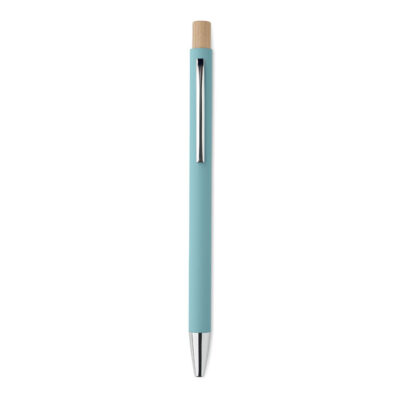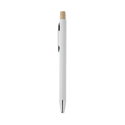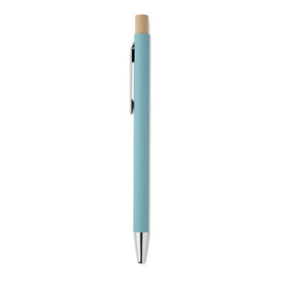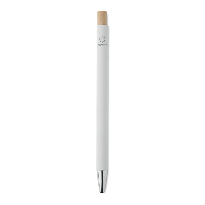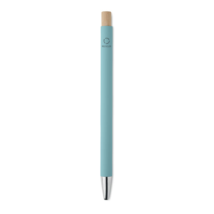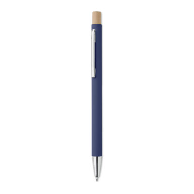 Recycled aluminum push ball pen. Silver tip and clip. Blue ink.