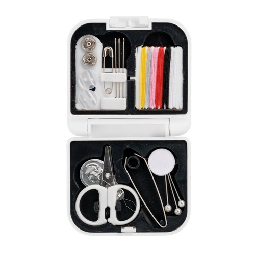 Convenient and lightweight travel sewing set. Sewing kit consisting of 3 pins, 3 needles, 1 pair of tweezers, 1 pair of scissors, 1 needle threader, 1 safety-pin, 2 buttons, 2 hooks and eye closures and 6 spools of thread in several colours. Supplied in a hard case. 70 x 21 x 65 mm