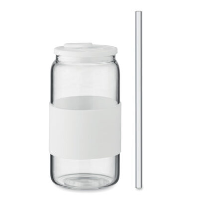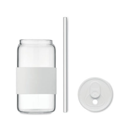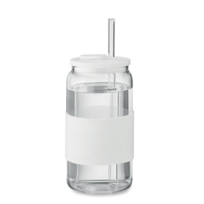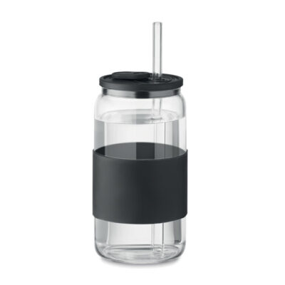 “High borosilicate glass tumbler with silicone lid and grip. Includes borosilicate glass straw. Capacity : 550 ml.”