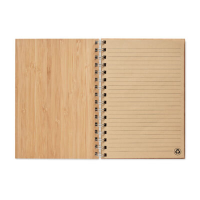 Bamboo cover notebook. Twin-wire ring bound, 140 lined kraft paper pages (70 sheets). Bamboo is a natural product, there may be slight variations in colour and size per item, which can affect the final decoration outcome.