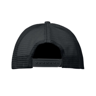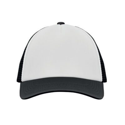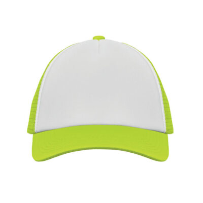 5 panel truckers cap in polyester 140-150 gr/m² with adjustment plastic snap closure. White front panel and color visor in polyester jersey with foam backing. Other panels in color mesh. Size 7 1/4.