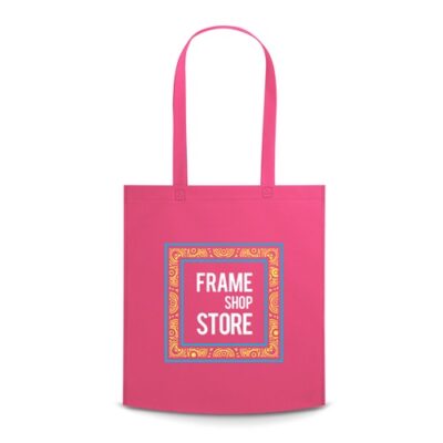 Thermo sealed non-woven bag (80 g/m²) with 75 cm handles. 380 x 415 x 85 mm