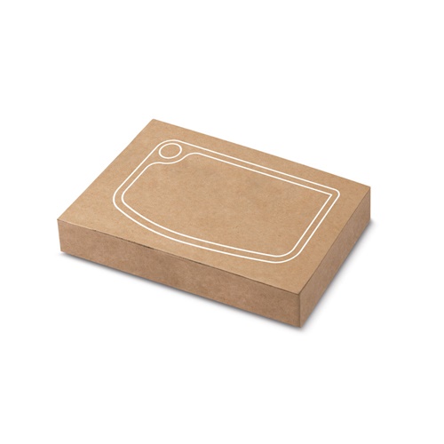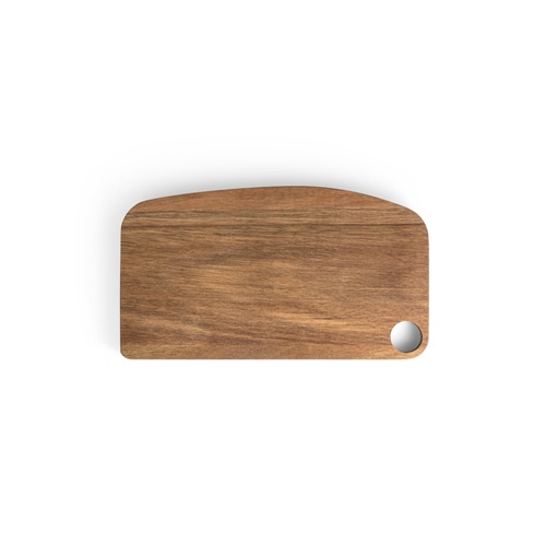 Acacia wood board with an edge around the board, made from FSC™ certified material and other controlled materials. The handle makes it easy to carry and it can be hung up for better storage. Combine this board with the Cassia – 94293 – to complete the set. Supplied with a gift box in kraft. 150 x 267 x 15 mm