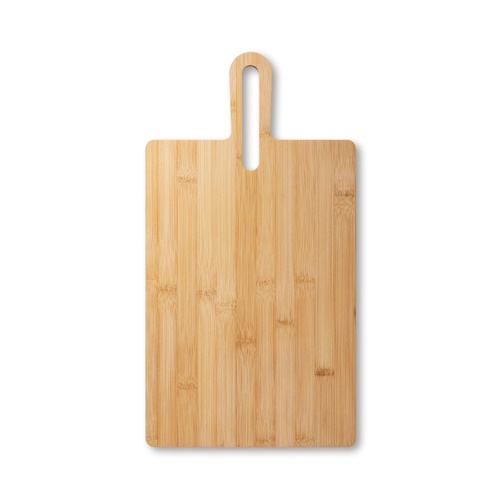 “Large bamboo serving board with handle, very versatile. Supplied with a kraft gift box. As the product is made from natural materials, the colour and the printing result may vary between products. 450 x 240 x 12 mm Promotion valid from 19/11/2024 until 20/12/2024 and limited to existing stock. For more information on the conditions of this promotion, please contact your account manager. “