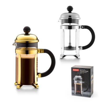 French press coffee maker with a high-quality borosilicate glass container. The glass is heat resistant and does not alter the natural flavour of the coffee. The integral stainless steel plunger prevents the beans from falling out of the coffee maker while the coffee is served. The chrome frame and lid have a durable and attractive shiny finish whilst the PP matte handle provides a comfortable grip which accentuates the quality of the design. The French press system is appreciated by coffee aficionados worldwide for its simplicity of preparation and purity of flavour. The Chambord coffee maker has a timeless design and is produced with the superior craftsmanship its devotees have come to expect. It has a capacity of up to 350 mL. Supplied in a gift box. 111 x 168 x 80 mm