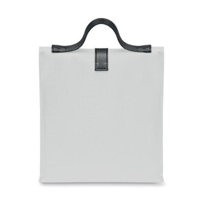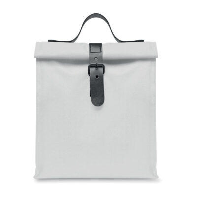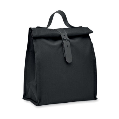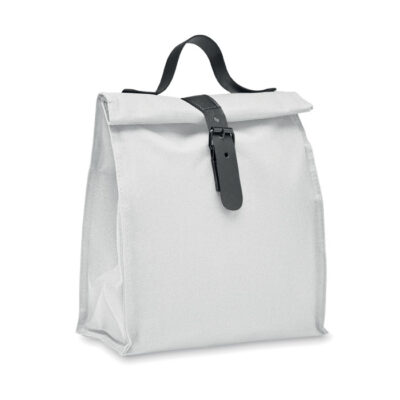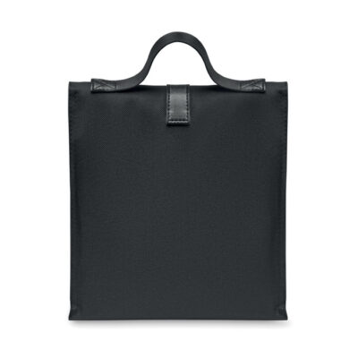 “600D RPET polyester insulated roll top lunch cooler bag with PU handle and closure. Insulation: 3mm PE foam with PEVA.”