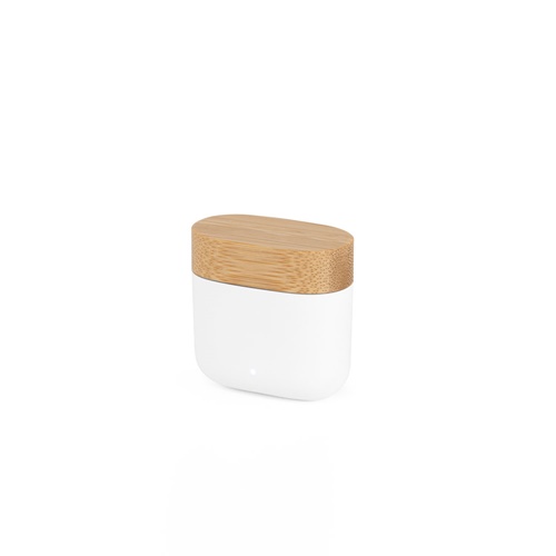 Wireless earphones made from recycled ABS (100% rABS) and a bamboo case with a lid, with BT v53 transmission. The charging case has a 300 mAh battery that allows you to charge the earphones approximately 3 times on a single charge, offering an autonomy of approximately 10 hours. The earphones allow you to answer calls, control the volume and playlist on your mobile device. Includes a USB-C charging cable made from TPE recycled (100% rTPE). Supplied in a kraft paper gift box. 48 x 26 x 47 mm