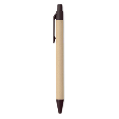 Push button paper barrel ball pen with parts made of 40% coffee husk and 60% ABS. Blue ink.