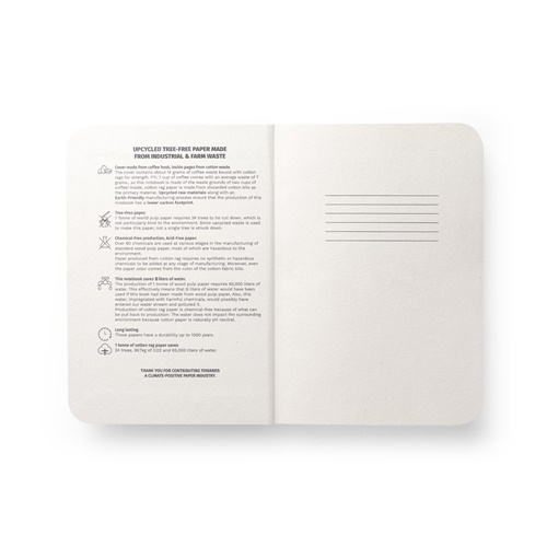 A5 notepad with semi-rigid cover made from coffee husk waste (65%) and cotton waste (35%). The inner paper is made from cotton (100%) waste and is highly durable. Contains 100 lined pages and paper band with artwork. No waste was generated and no chemicals or trees were used in the manufacturing process of this notebook. As the product is made from natural materials, the colour and the printing result may vary between products. 140 x 200 mm