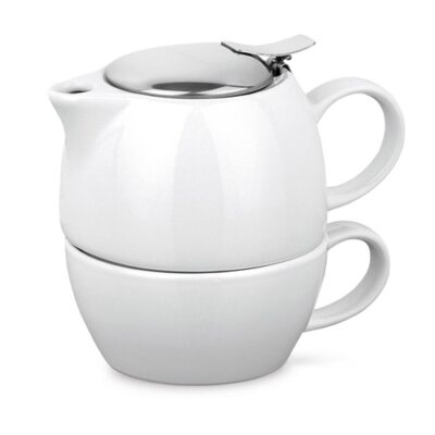 2 in 1 porcelain tea set. The set includes a teapot with stainless steel strainer (440 mL) and a mug with capacity up to 280 mL. Supplied in a gift box. ø113 x 140 mm