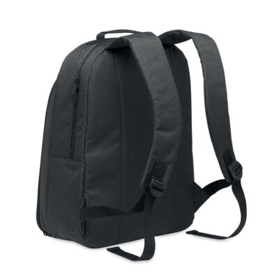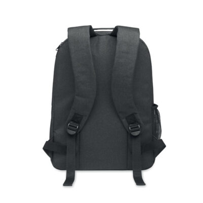 300D RPET cooling backpack with 15 inch laptop compartment. Front zipper pocket and one side mesh compartment.