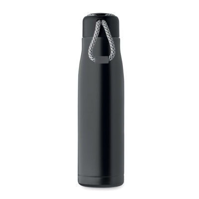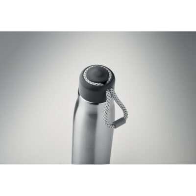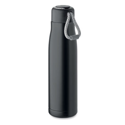 “Double wall recycled stainless steel insulated vacuum bottle (90% recycled stainless steel and 10% stainless steel) with integrated cord grip on PP lid. Leak-free. Capacity: 500 ml.”