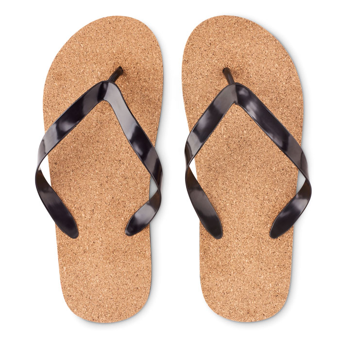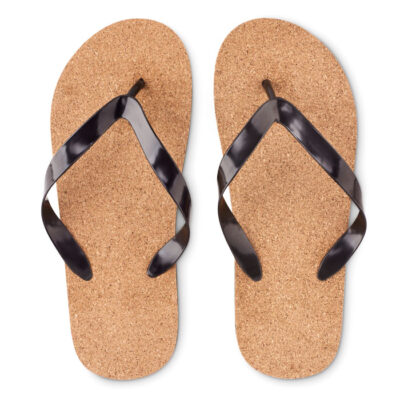 Beach slippers with cork and EVA sole and PVC straps. Size L fits 40-43. Cork is a natural material, due to its structural nature and surface porosity the final print result per item may have deviations.