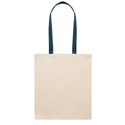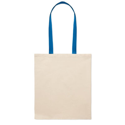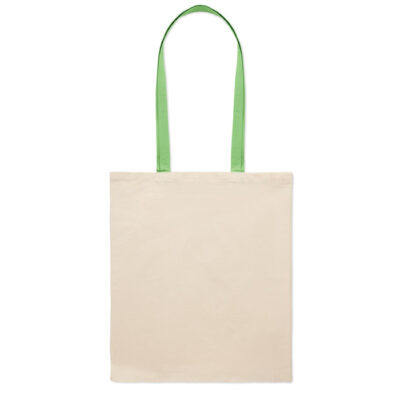Shopping bag with long coloured handles made from cotton. 140 gr/m². This tote is perfect for daily groceries or other shopping activities. It’s available with various coloured handles. Carry the bag over your shoulder when it’s heavy and to keep your hands free. Carry weight limit: 2.5kgs.