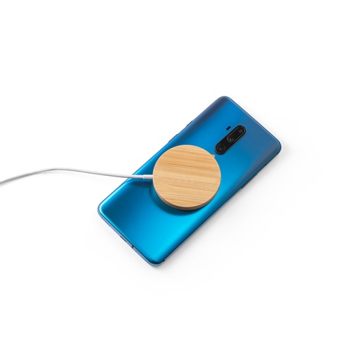 Super-fast magnetic wireless bamboo charger. Thanks to the magnets, it can be perfectly attached to your smartphone. Maximum wireless charging power of 15W, for super-fast charging. Includes a 1 metre USB-C cable. Compatible with mobile devices with wireless charging technology. Supplied in a kraft paper gift box. As the product is made from natural materials, the colour and size of the product and the printing result may vary between products. Ø59 x 8 mm