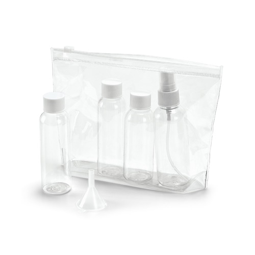 Airtight PVC cosmetic bag that includes 3 bottles (2 x 65 mL and 1 x 60 mL), 1 vaporiser (80 mL) and 1 funnel. Ideal for travelling by plane. 190 x 155 x 40 mm
