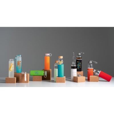 Borosilicate glass bottle with PP screw-on lid. This bottle has a silicone protection. It has a capacity up to 380 mL. Supplied in a gift box. ø58 x 191 mm