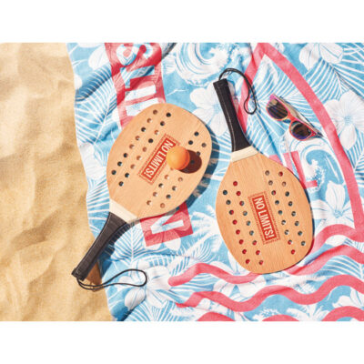 Beach tennis set consisting of 2 Rosewood paddles with PU taped grip and 1 soft ball. Presented in cotton pouch.