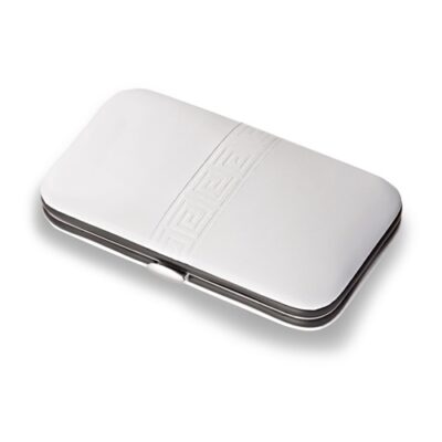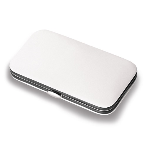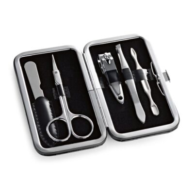 Five-piece manicure set with nail file, scissors, nail clipper, tweezers and cuticle pusher. Supplied in a PU case. 110 x 65 x 20 mm