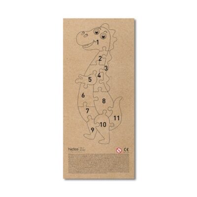 Dinosaur-shaped puzzle in pine plywood. Each part is numbered to aid assembly. The base, also in plywood, is customizable. Supplied in a kraft paper gift box. As the product is made from natural materials, the colour and the printing result may vary between products. 128 x 298 mm