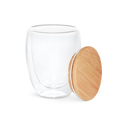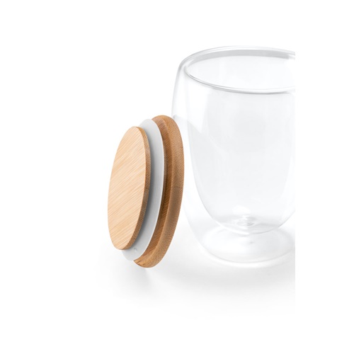 Double wall air-insulated borosilicate glass travel cup with bamboo lid. Cup with a capacity of up to 350 mL, ideal for cold or hot liquids. The silicone-insulated lid prevents spillages during transportation. Microwave and dishwasher safe, when the lid is removed. Supplied in a kraft paper gift box. As the product is made from natural materials, the colour and the printing result may vary between products. ø91 x 119 mm