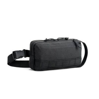 Waist bag in high-density 600D recycled polyester and 210D recycled polyester lining. It has a spacious main compartment, a pocket and multifunctional straps on the front. The bag has an adjustable handle and strap that allows it to be worn around the waist or on the shoulder. 240 x 130 x 80 mm