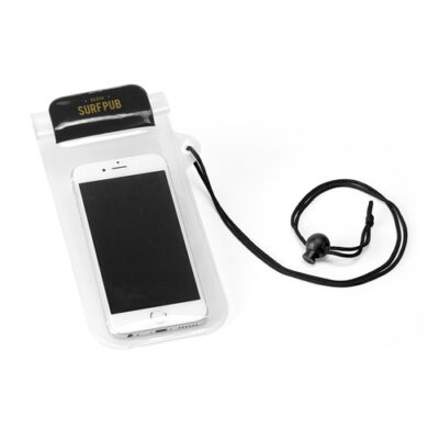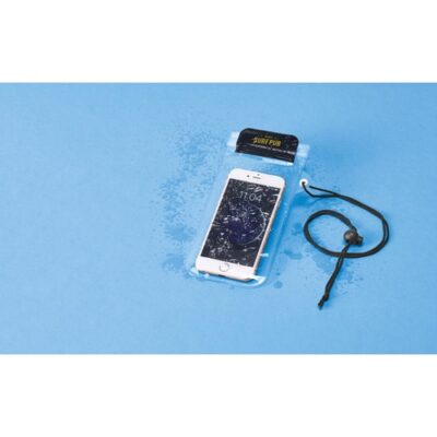 Waterproof phone bag in PVC with adjustable strap and spring lock. Clear on the front and matte white on the back. It allows the user to interact with the screen from the outside. The bag has an airtight closure and colourful flap with a self-adhesive hook and loop fastener. 95 x 240 mm