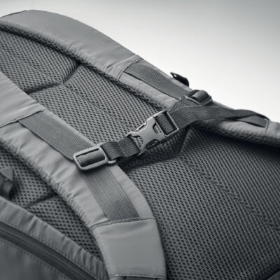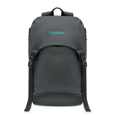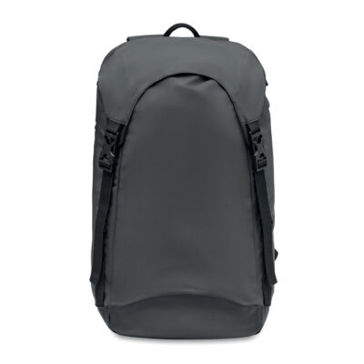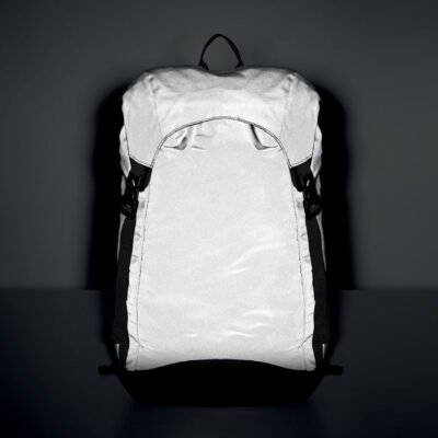 Outdoor backpack in 190T polyester coated with reflective granules. Side zippered outer pocket and padded back, inner lining with drawcord closure. One large padded inner laptop compartment. It has adjustable padded shoulder straps and adjustable chest and waist strap with buckle closure. Water repellent.