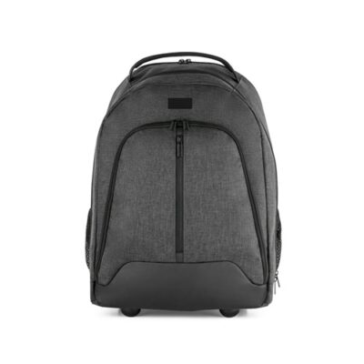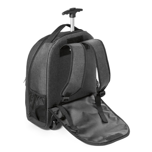 Laptop trolley backpack in high density 600D and waterproof 600D polyester. Main compartment for laptop up to 156. Contains mesh side pockets and a double zipped front pocket. Trolley backpack with wheel protector and extendable metal handle. The back and handles are padded. Includes a removable magnetic metal plate for easy customization. Capacity up to 21 L. 340 x 430 x 170 mm | Plate: 50 x 20 mm