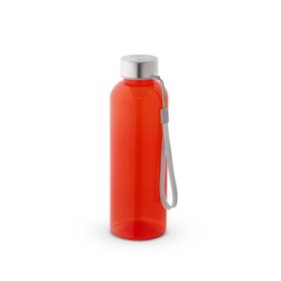 Bottle in recycled PET (100% rPET) with a translucent glossy finish. Leak-proof stainless steel lid with polyester rope for easy transport. Capacity up to 600 mL. ø65 x 210 mm
