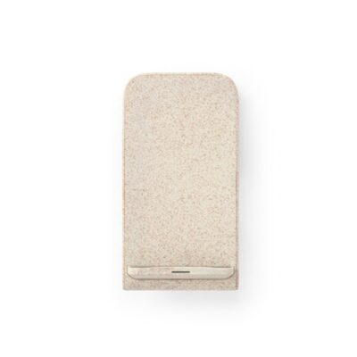 Wheat straw fiber and ABS mobile phone holder with dual coil wireless charger. With a fast charging power of 10W and with 5V/2A and 9V/167A inputs. Includes USB cable to charge. Supplied in a kraft paper gift box. 70 x 112 x 87 mm