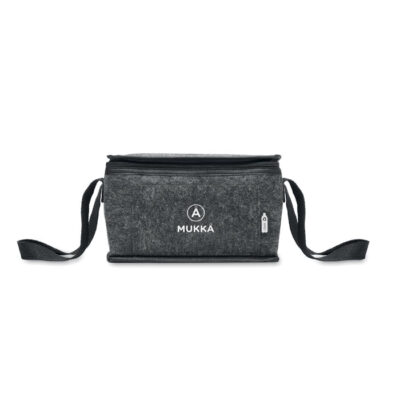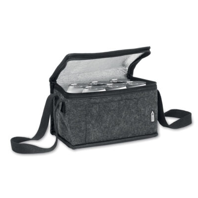 “RPET felt cooler bag with front pocket. 1mm RPET felt and 3 mm insulation aluminium laminated foil. Capacity: 5L.”