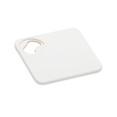 Coaster with bottle opener and non-slip sponge on the base. 82 x 82 x 4 mm