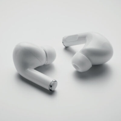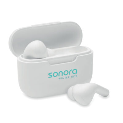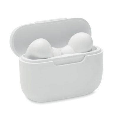 ABS True Wireless Stereo (TWS) 5.3 wireless stereo earbuds with microphone and 30 mAh battery. Playing time approx. 3 hours. Type-C input. Auto-pairing. Including a Type C charging cable and a 180 mAh charging station.