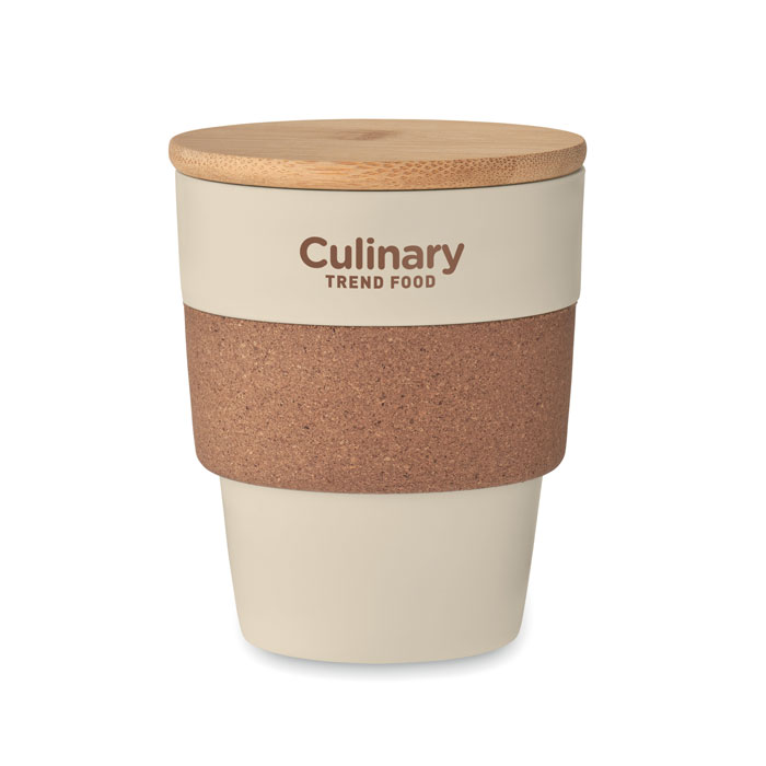 Single wall tumbler in recycled PP with cork protective sleeve and bamboo lid. Capacity: 300 ml. As this is a single walled mug heat transfer can still occur. Bamboo is a natural product, there may be slight variations in colour and size per item, which can affect the final decoration outcome.