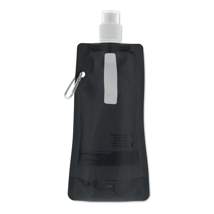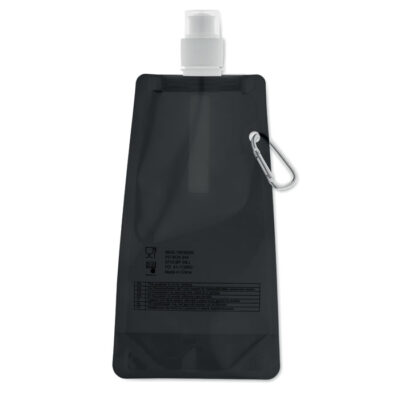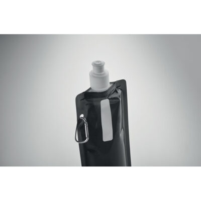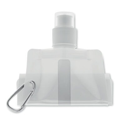 Foldable water bottle in PET which is BPA free with aluminium carabiner. Capacity 480 ml. Leak free.